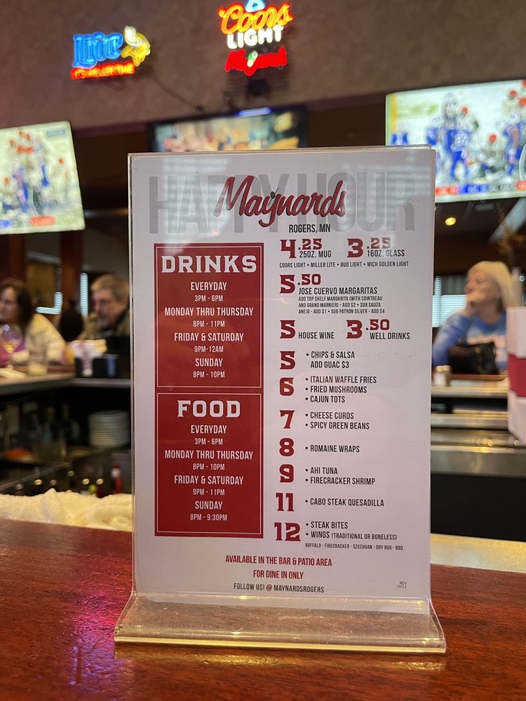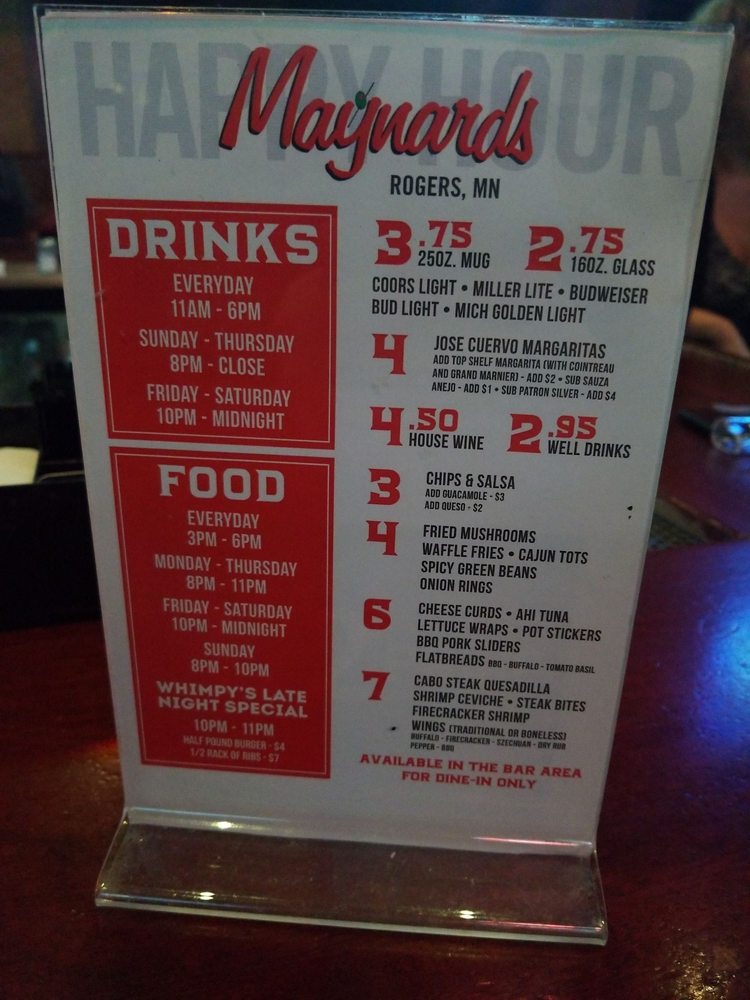 Maynard's Restaurant - Rogers is a vibrant sports bar in Rogers, MN, offering a wide range of American dishes. With a cozy atmosphere and attentive staff, it's a great spot for casual dining. The menu boasts delicious options like Boneless Buffalo wings, Black and Bleu burger, Clubhouse sandwich, and Pastrami Reuben. Customers have raved about the generous portion sizes and flavorful dishes. The walleye sandwich and buffalo chicken strips with waffle fries are standouts, though some dishes like the coleslaw have received mixed reviews. The Carrot Cake for Sharing is a must-try dessert. The bar menu features a variety of specialty cocktails, with reasonable prices. Maynard's is a popular spot for families and groups, perfect for a laid-back lunch or dinner outing. Remember to make a reservation, especially on busy nights like Fridays. Overall, a solid choice for a satisfying meal and good times.